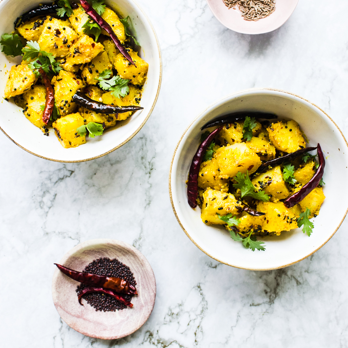 These Gujarati aloo are a quick and flavorful side. They derive their punchy flavor from a rich tempering of kadi patta, cumin and mustard seeds.