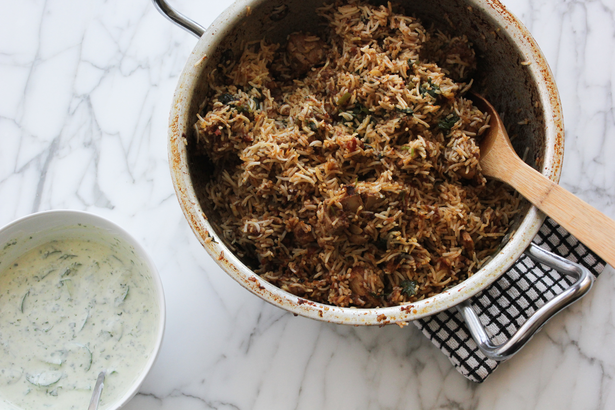 For those who find whole spices over-whelming, you can omit the whole cumin seeds in the rice. For the chicken korma, you can remove them with a slotted spoon before you layer it with the rice.